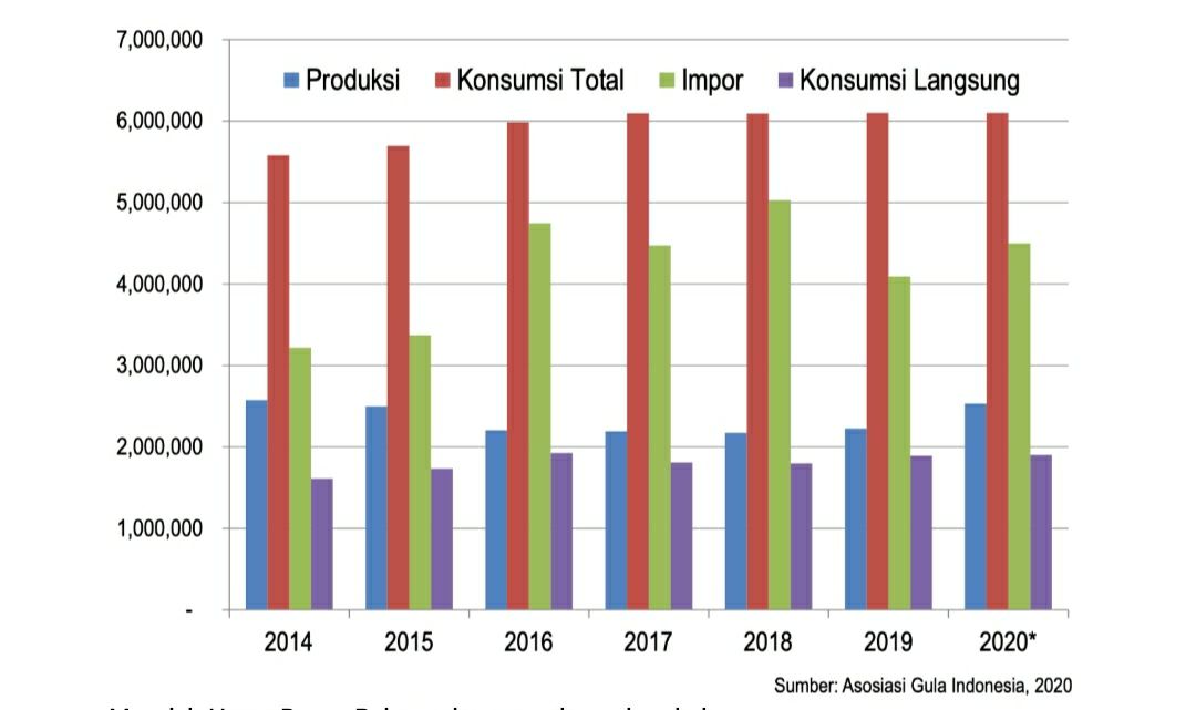Gambar: Produksi Gula Nasional 2014-2020: Panen Gula Nasional baru dapat dilakukan bulan Juli 2020, terdapat titik kritis suplai gula bulan Mei dan Juni 2020.