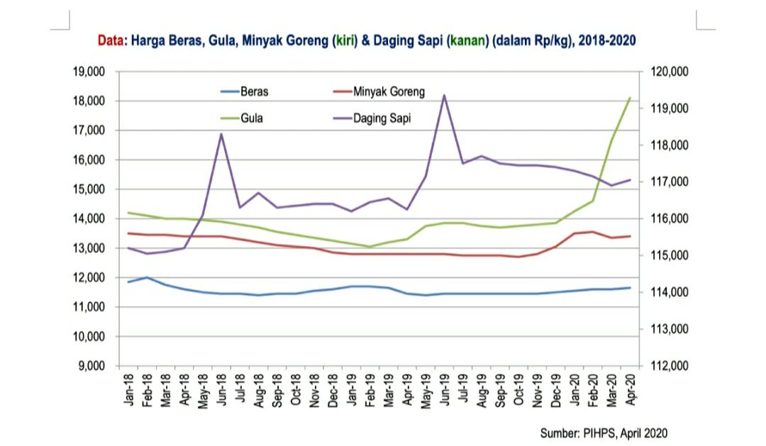 Berdasarkan data sepanjang 2018-2020, harga beras, minyak goreng dan daging sapi sebenarnta relatif stabil. Peningkatan tinggi terjadi pada harga gula (data 21 April 2020). Harga gula kini mencapai Rp19.000 per kg dibandingkan Januari 2020 sebesar Rp14.000 per kg.
