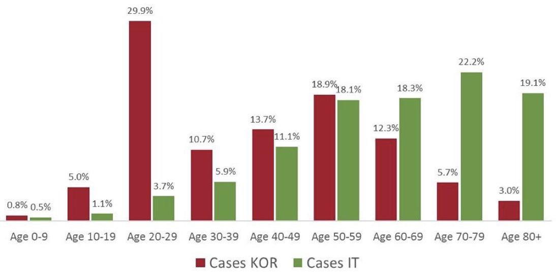 Perbedaan penanganan Covid-19 antara Korea Selatan dan Italia adalah Korea Selatan melakukan tes massal random sedangkan Italia melakukan tes hanya kepada individu yang memiliki simptomatic cases. Hasilnya 40.7% positif Covid-19 adalah mereka usia 20-39 (milenial) di Korea bandingkan di Italia hanya 9,6% mereka pada usia sama. Sedangkan orang tua usia 60-80+ tahun terdapat kasus positif Covid-19 sebesar 59.65% (Italia) dan 21% (Korea Selatan).