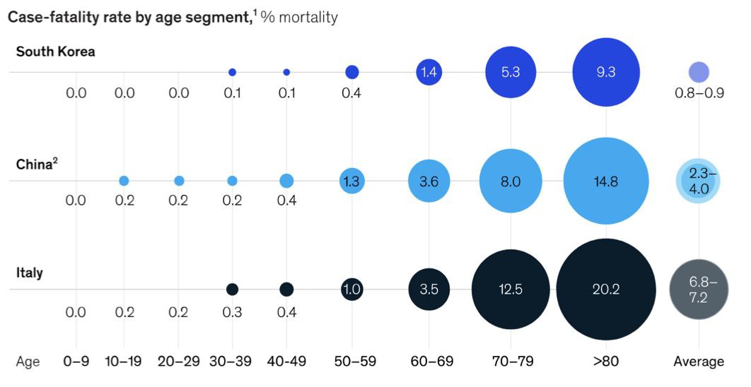 Meskipun tidak ada pola usia terhadap exposure penyebaran Covid-19, namun terdapat pola fatalitas kematian pada usia tertentu baik di Italia, Korea Selatan dan China. Individu berusia 60-80 keatas adalah yang paling beresiko kematian bila mereka terpapar virus tersebut. Italia fatality rate usia 60-69 sebesar 3.5%, usia 70-79 sebesar 12.5?n usia diatas 80 sebesar 20.2%. Secara rata-rata fatality rate di Italia sebesar 6.8-7.2% paling tinggi dibandingkan China (2.3-4.0%) dan Korea (0.8-0.9%).