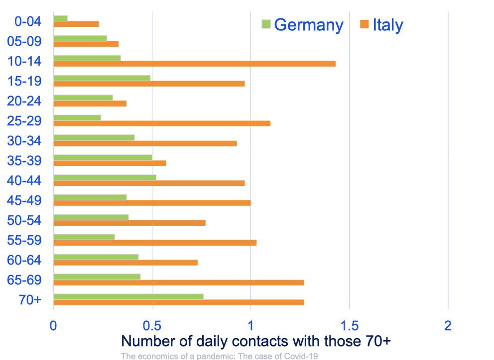 Gambar 3: menunjukan usia diatas 70 tahun orang Italia lebih banyak terkoneksi dengan usia 10-29 dibandingkan Jerman.