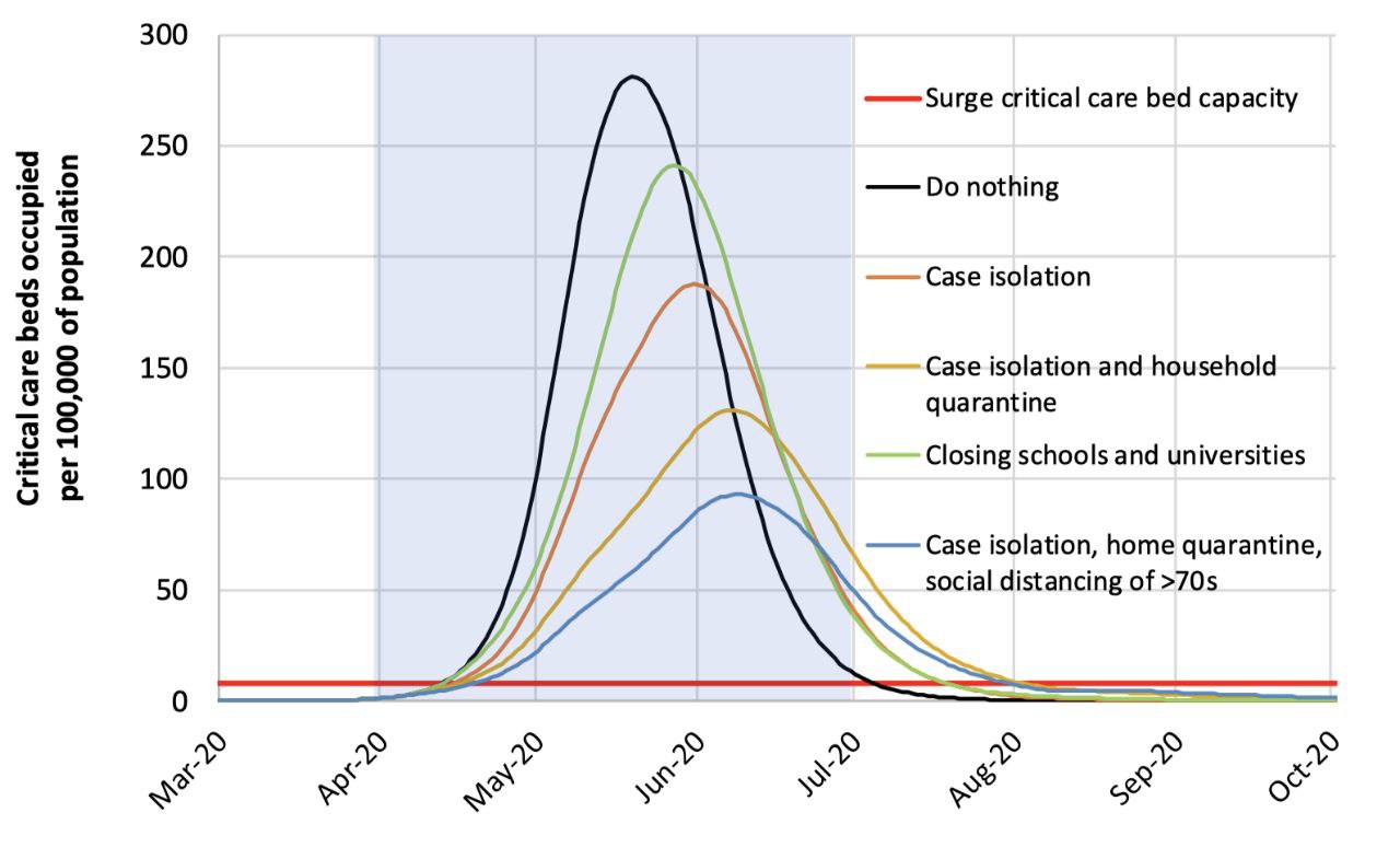 Gambar 4: menunjukan grafik mitigasi penanganan virus dengan berbagai skenario yang memperhitungkan jumlah tempat tidur untuk kasus kritis. Untuk negara dengan kapasitas tempat tidur dibawah 100 per 100 ribu populasi mitigasi yang paling tepat adalah isolasi/lockdown atau karantina rumah total dan social distancing untuk individu berusia diatas 70 tahun. Indonesia berada di level 120 sehingga secara teori yang paling tepat adalah Isolasi/lockdown atau karantina rumah tangga.