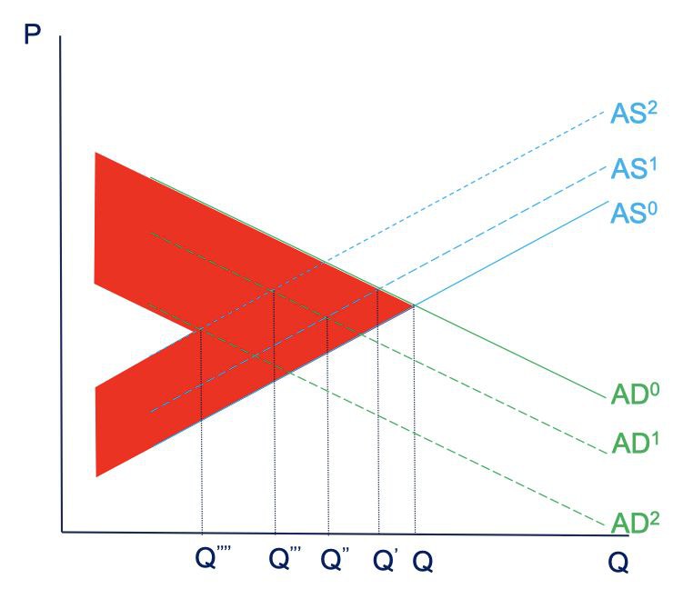 Gambar 5: Warna merah menunjukan Economic Surplus yang tergerus karena Wabah CV19. Grafik Suplai AS0 berpindah ke AS1, AS1 pindah mempengaruhi berkurangnya permintaan menjadi AD1 dari AD0. Permintaan yang berkurang AD1 akan pengaruhi grafik permintaan ke posisi baru yaitu AS2 dari AS1. AS2 direspon dengan permintaan ekonomi yang terus berkurang menjadi Q’’’ sehingga melahirkan grafik permintaan baru AD2.