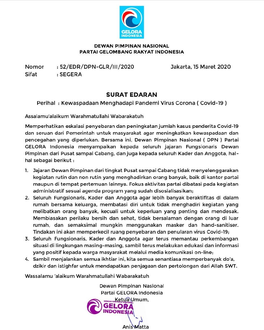 Ketua Umum Partai Gelora Indonesia, Anis Matta mengeluarkan surat edaran terkait penyebaran virus Corona di Indonesia.