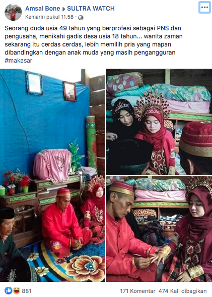 MAKASSAR - Pernikahan seorang remaja putri berusia 20 dengan pria berusia 40 di tengah pandemi virus corona, viral di media sosial.