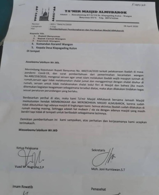 "Karena sudah tidak dibutuhkan lagi adanya masjid di lingkungan kami. Semua aktivitas ibadah sudah dilakukan di rumah masing-masing," demikian kutipan singkat isi surat itu.