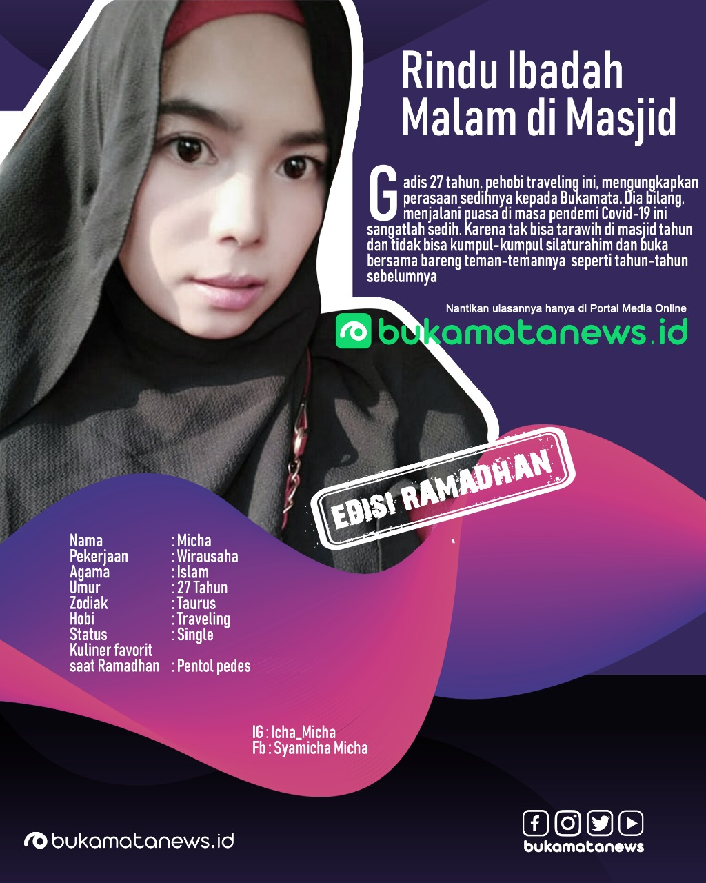 Gadis 27 tahun, pehobi traveling ini, mengungkapkan perasaan sedihnya kepada Bukamata. Dia bilang, menjalani puasa di masa pendemi Covid-19 ini sangatlah sedih. Karena tak bisa tarawih di masjid tahun dan tidak bisa kumpul-kumpul silaturahim dan buka bersama bareng teman-temannya seperti tahun-tahun sebelumnya.