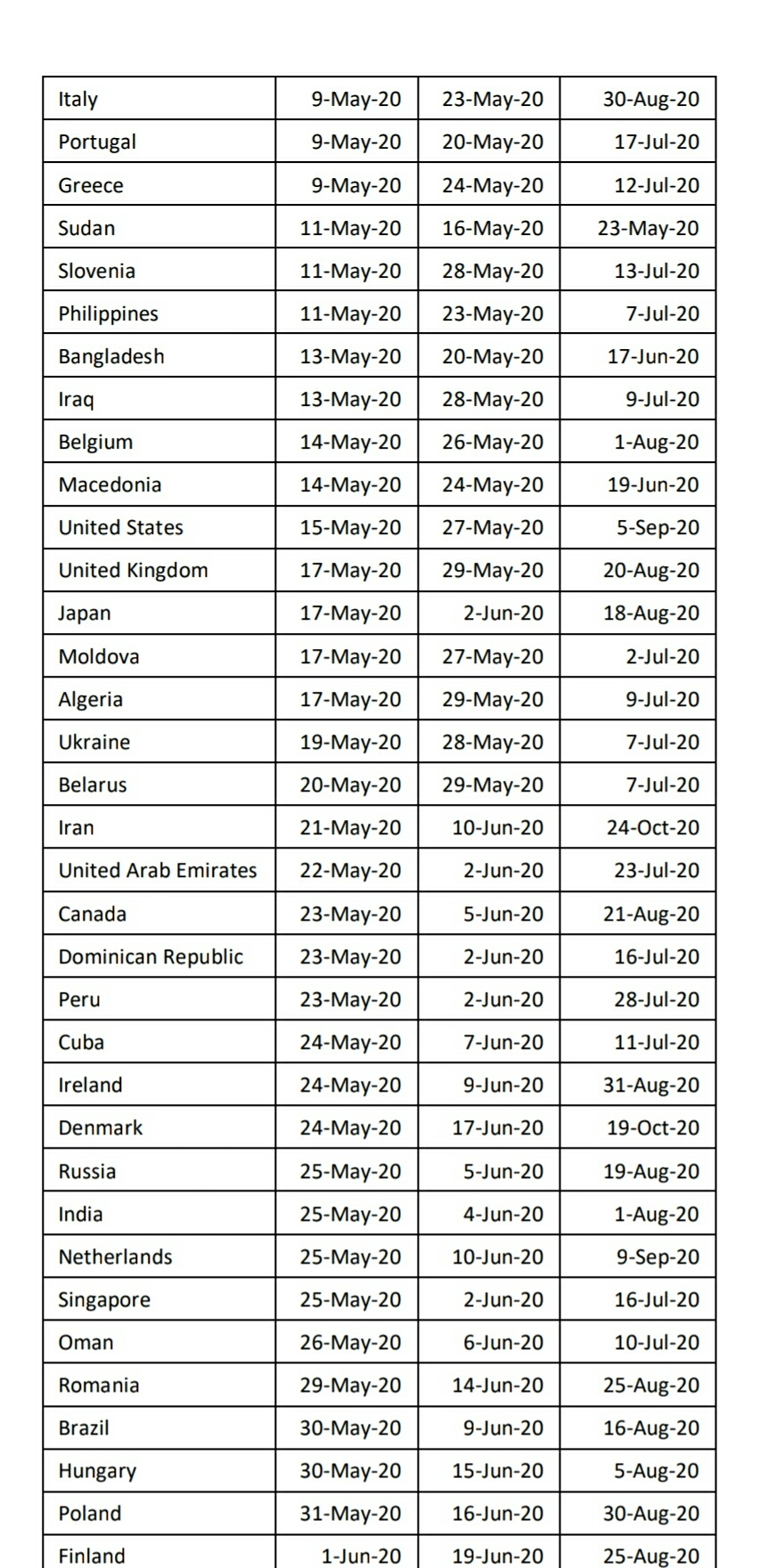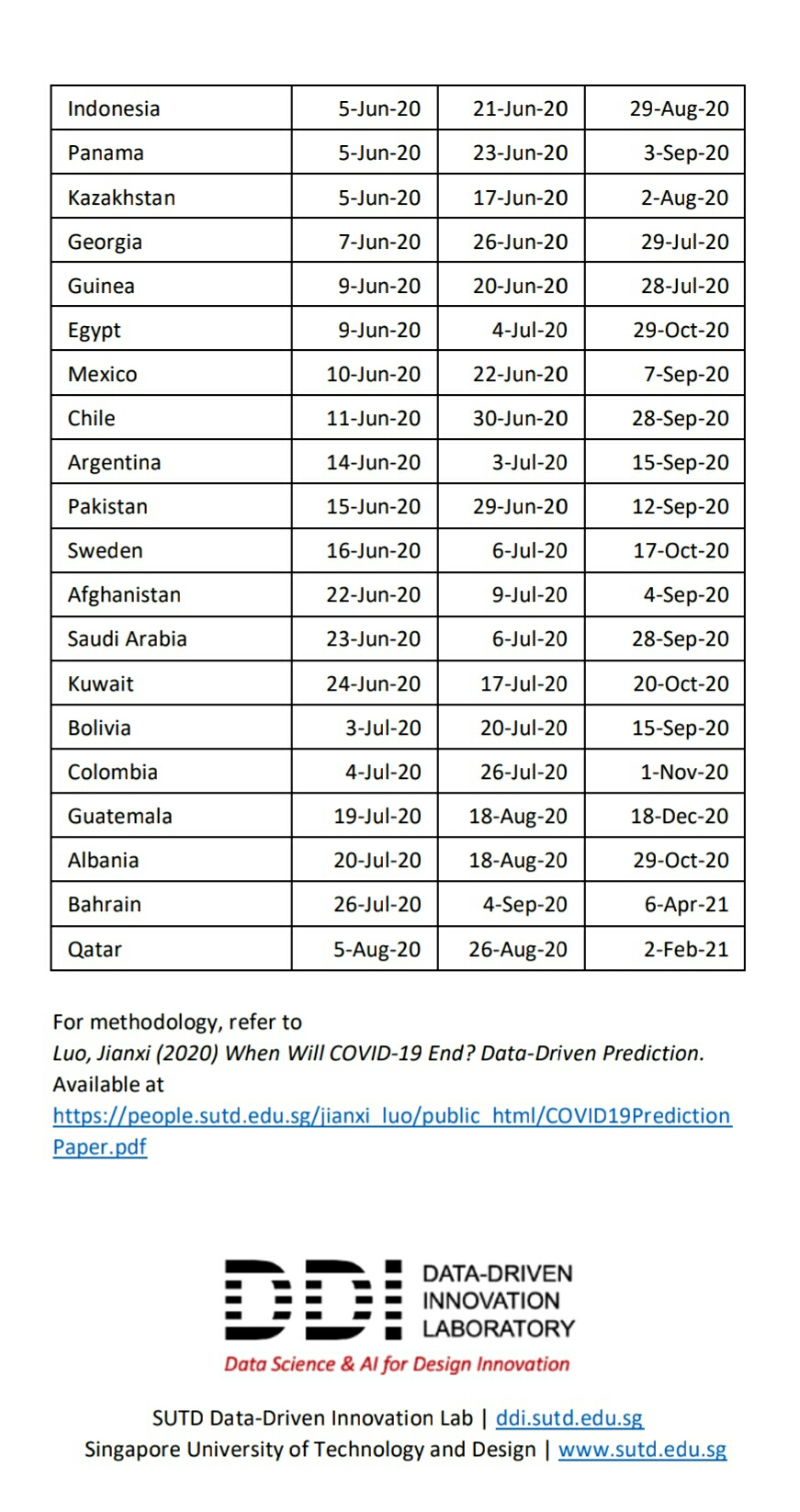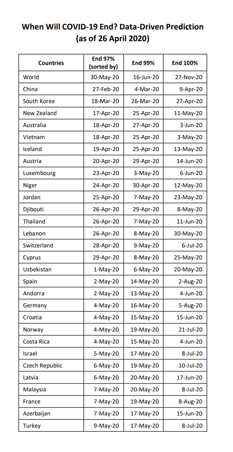 Dalam prediksi yang dikeluarkan Luo pada 26 April 2020 itu, disebutkan China adalah negara pertama yang dinyatakan bebas dari Covid-19, yakni pada 9 April 2020,, disusul Korea Selatan pada 27 April 2020, dan New Zealand pada 11 Mei 2020.