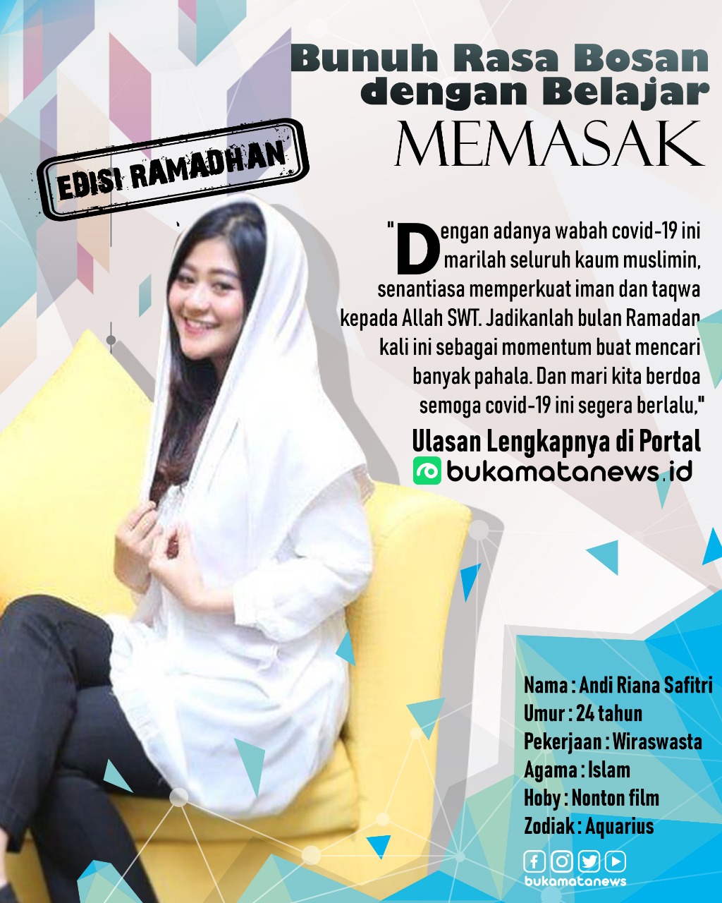 Ramadan tahun ini kata gadis Aquarius ini, benar-benar berbeda dari biasanya. Kemeriahan ibadah jauh berkurang dari Ramadan tahun sebelumnya. Ibadah kali ini kata dia, dihadapi dengan rasa kewaspadaan akibat covid-19.