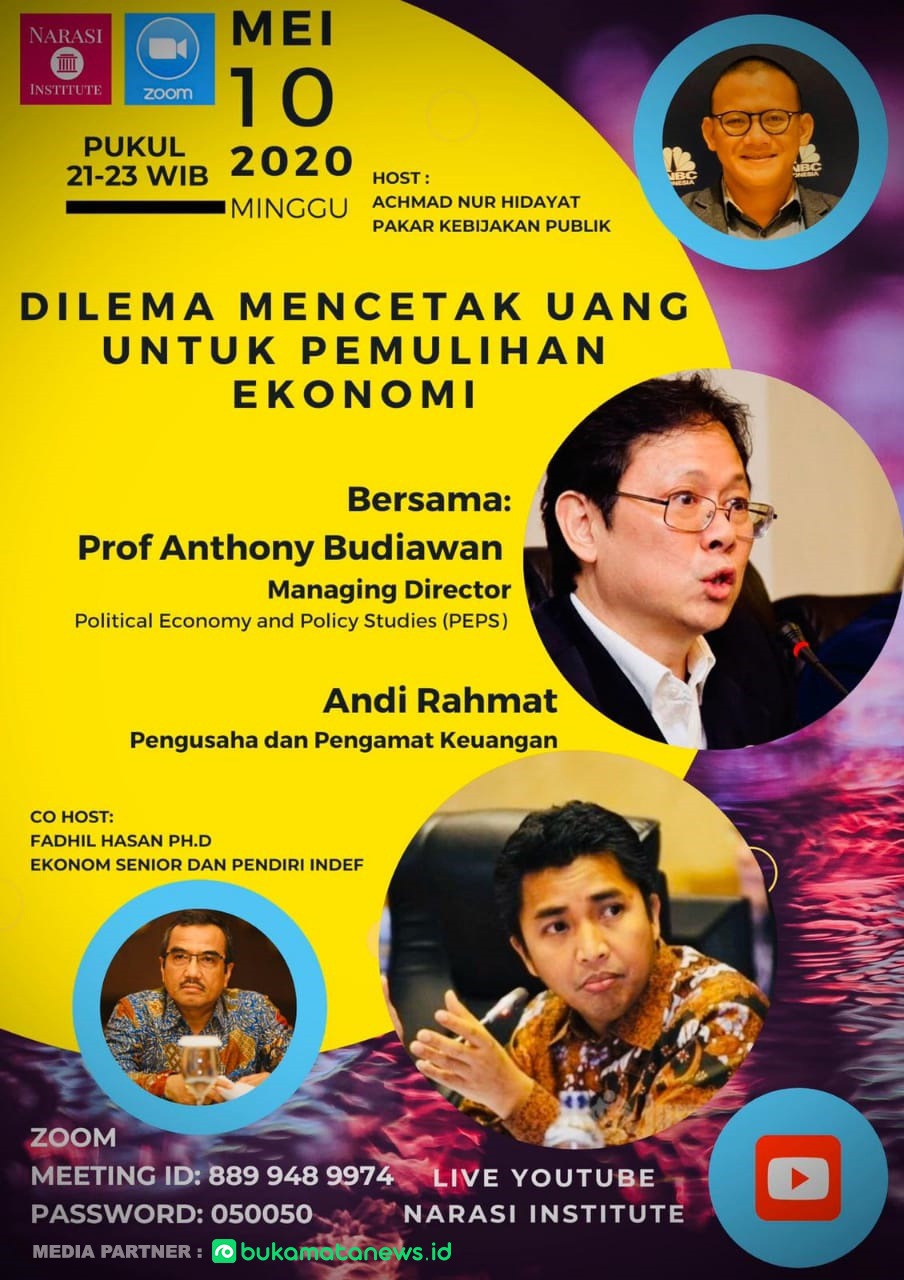 BUKAMATA - Zoominari Narasi Institute kali ini, mengangkat tema "Dilema Mencetak Uang untuk Pemulihan Ekonomi". Dipandu Founder Narasi Institute, Achmad Nur Hidayat, diskusi kali ini menghadirkan Prof Anthony Budiawan (Managing Director Political Studies PEPS) dan Andi Rahmat (Pengusaha dan Pengamat Keuangan). Juga ekonom senior, Fadhil Hasan.