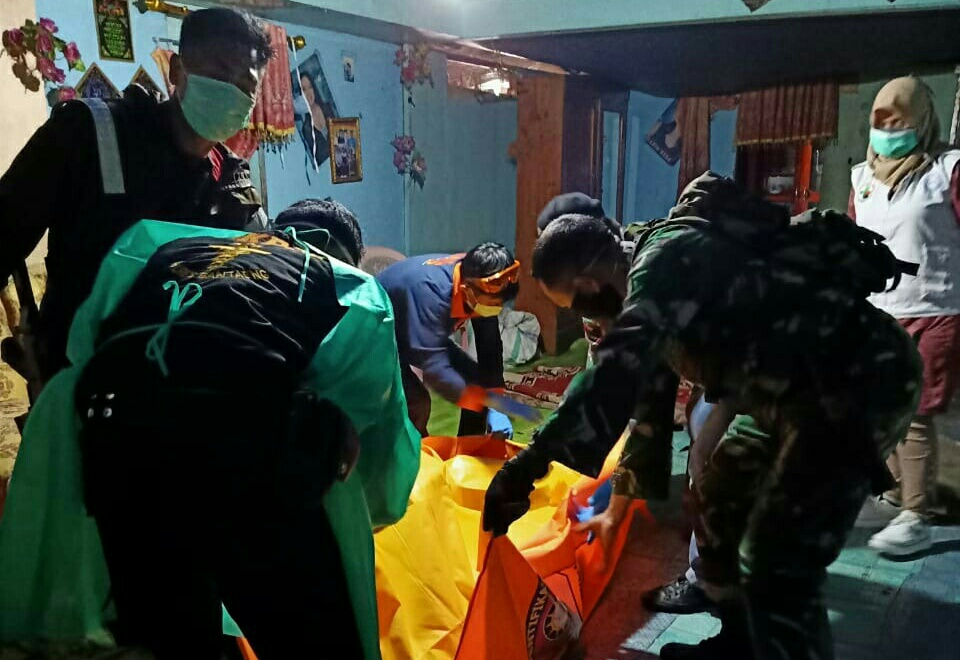 Melihat darah mengucur, seorang anggota keluarga mengambil wadah, menadah darah yang mengucur di kolong rumah.