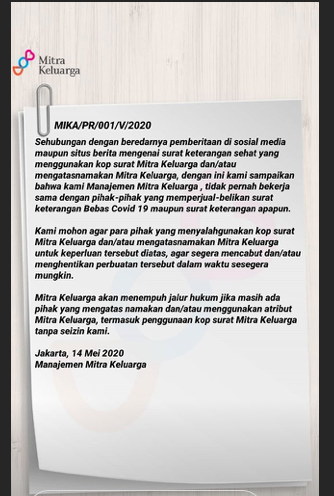"Sehubungan dengan beredarnya pemberitaan di sosial media maupun situs berita mengenai surat keterangan yang menggunakan kop surat Mitra Keluarga dan/atau mengatasnamakan Mitra Keluarga, dengan ini kami sampaikan bahwa kami Manajemen Mitra Keluarga, tidak pernah bekerja sama dengan pihak-pihak yang memperjual-belikan surat keterangan Bebas Covid 19 maupun surat keterangan apapun," tulis Rumah Sakit Mitra Keluarga di Instagram.