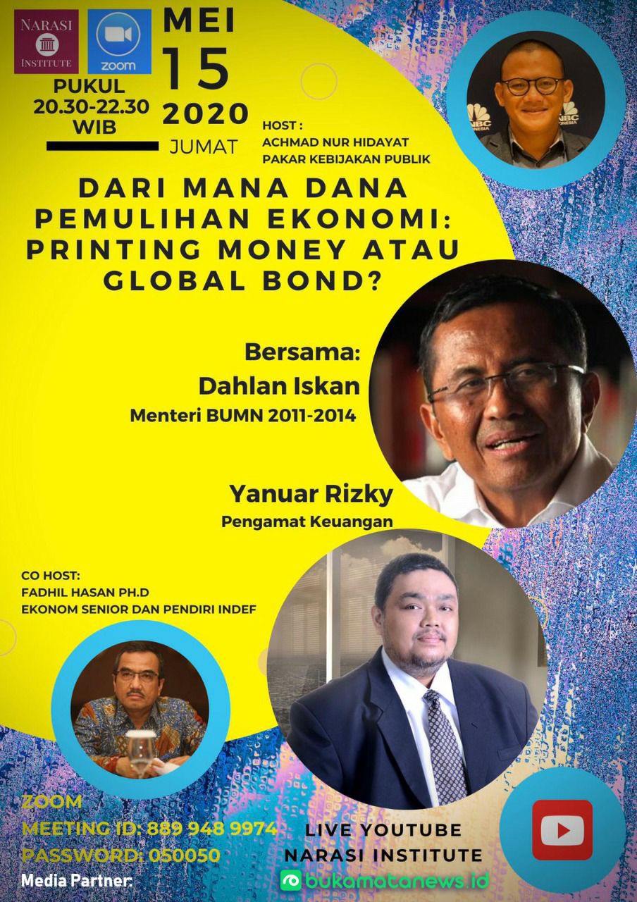Hal tersebut diungkapkan Dahlan Iskan dalam sesi diskusi online bertema 'Dari mana dan pemulihan ekonomi: Printing money atau global bond?'. Diskusi itu dipandu Direktur Eksekutif Narasi Institute Achmad Nur Hidayat.