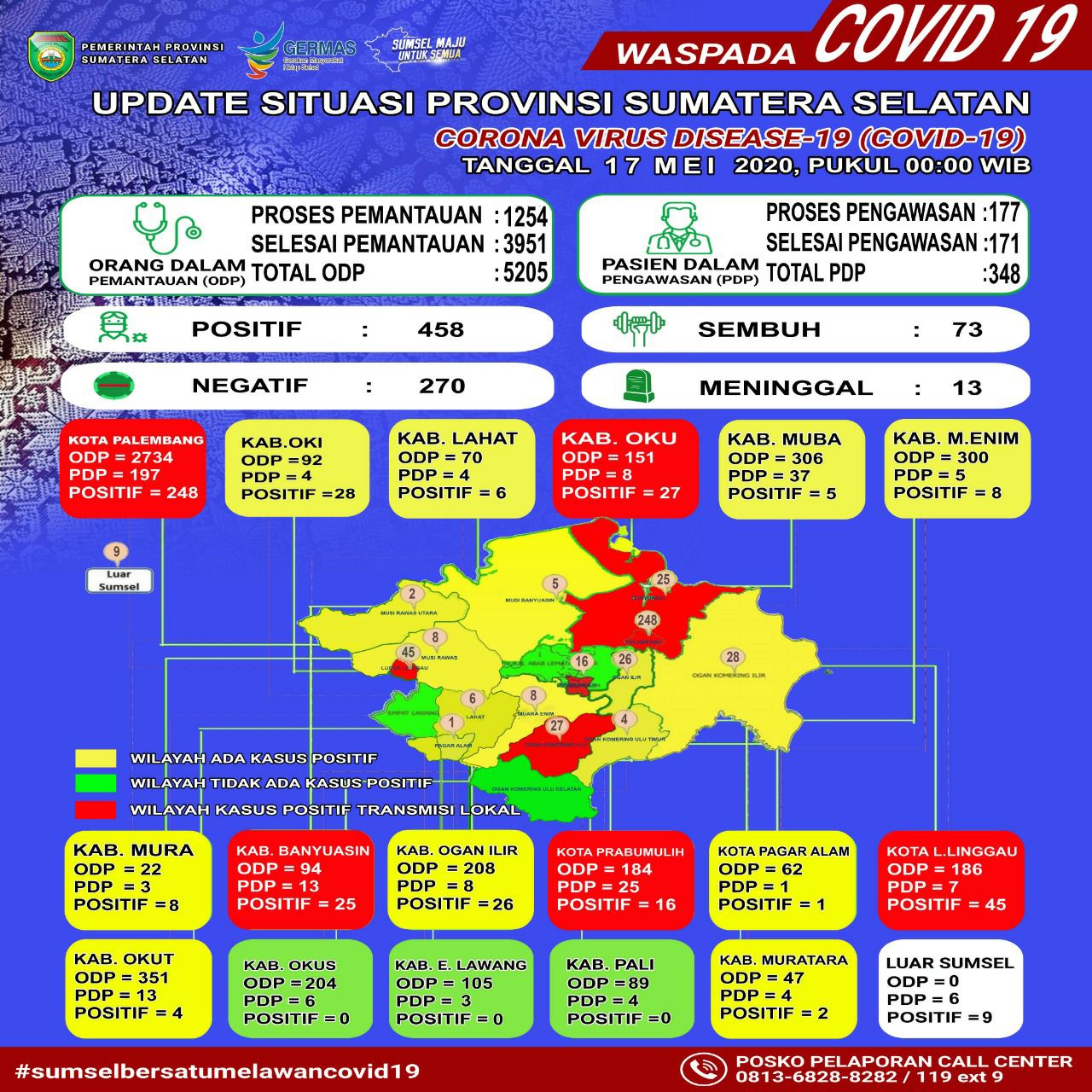 PALEMBANG, BUKAMATA - Gubernur Sumsel, H Herman Deru melalui Juru Bicara Gugus Tugas Covid-19 Sumsel, H. Yusri mengungkapkan, hingga Minggu (17/5/2020), pasien positif corona sebanyak 458 orang.