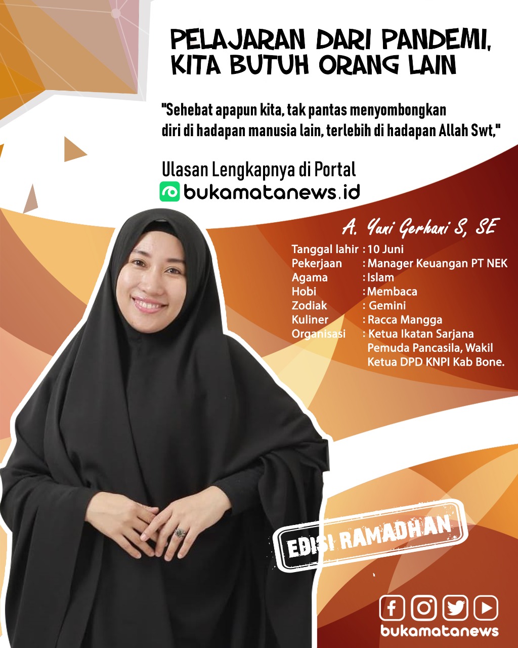 BUKAMATA - Pandemi Covid-19 bertepatan dengan datangnya Ramadan. Tentu ada perbedaan, tapi prinsipnya puasa harus tetap dijalankan seperti suasana normal. Karena itu kewajiban selaku muslim. Demikian diungkap Andi Yuni Gerhani S, SE. Manajer Keuangan PT NEK, perusahaan yang bergerak di bidang distribusi solar industri Pertamina.