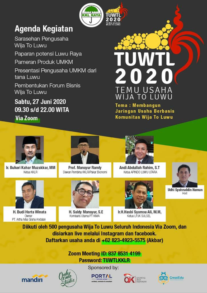 Acara yang mengusung tema 'Membangun jaringan usaha berbasis komunitas Wija To Luwu' ini akan berlangsung di tanggal 27 Juni 2020 dari jam 10.00-22.00 WITA.