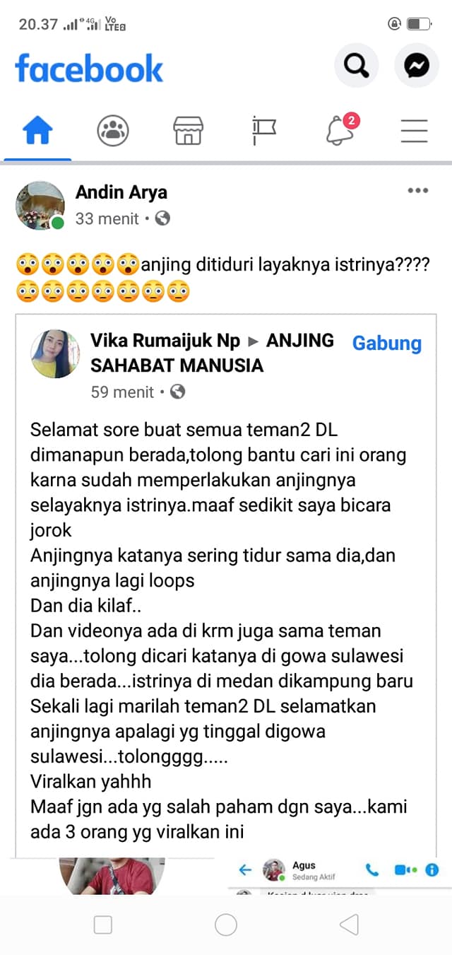 Sebelumnya, dalam tangkapan layar percakapan, AH mengaku dia saat ini tinggal di hutan Gowa. Istrinya tinggal di Medan. Istrinya sedang hamil. Sedang dia kesepian di hutan Gowa. Karenanya, dia mengaku khilaf, telah menyetubuhi anjingnya.