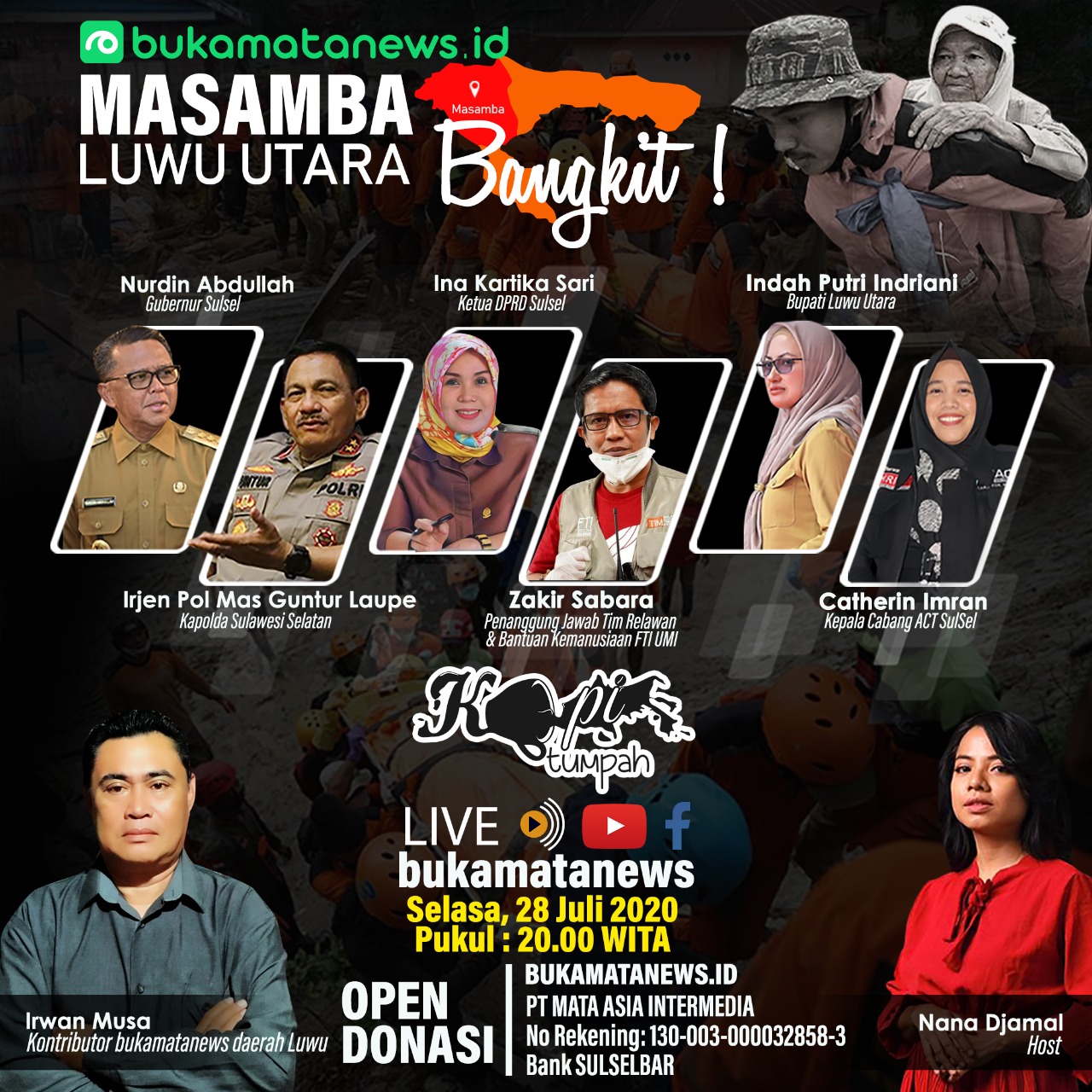 Bukamatanews akan mengulas hal ini dalam program diskusi Kopi Tumpah yang mengangkat tema "Luwu Utara Bangkit", Selasa (28/7/2020). Pada program yang disiarkan secara live melalui Facebook dan YouTube Bukamatanews, akan menghadirkan narasumber yaitu Gubernur Sulsel Prof Nurdin Abdullah, Kapolda Sulsel Irjen Pol Mas Guntur Laupe, Ketua DPRD Sulsel Ina Kartika Sari, dan Bupati Luwu Utara Indah Putri Indriani.