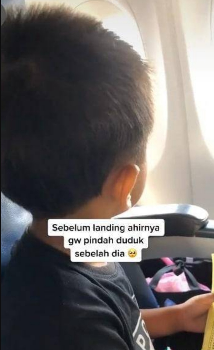Sebelum landing akhirnya gw pindah duduk sebelah dia,” tulis pengunggah dalam videonya.