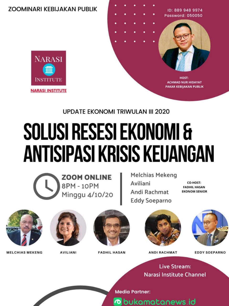 BUKAMATA - Narasi Institute kembali menggelar Zoominari. Temanya, "Solusi Resesi Ekonomi dan Antisipasi Krisis Keuangan". Menghadirkan beberapa ekonom, politisi dan pengusaha. Ada Melchias Mekeng, Aviliani, Fadil Hasan, Andi Rachmat, dan Eddy Soeparno.