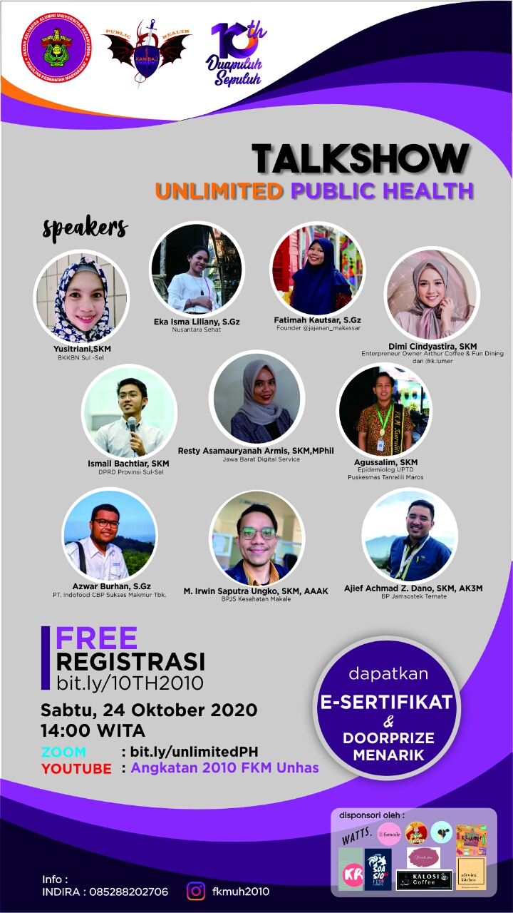 MAKASSAR, BUKAMATA - Ini dalam rangka ulang tahun ke-10, Angkatan 2010 Fakultas Kesehatan Masyarakat Universitas Hasanuddin (FKM Unhas). Diperingati dalam bentuk talkshow. Temanya, Unlimited Public Heallth. Dikemas secara daring Sabtu, 24 Oktober 2020 Pukul 14.00 Wita.