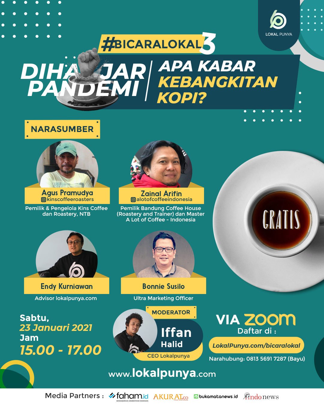 Menghadirkan 4 narasumber spesial yang terdiri dari pebisnis kopi lokal yang makin moncer justru di situasi sulit, pegiat inkubator dan akselerator usaha rintisan khususnya yang bergerak di sektor makanan dan minuman, dan praktisi lokapasar khusus produk lokal yang sedang bertumbuh cepat.