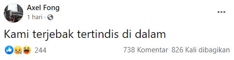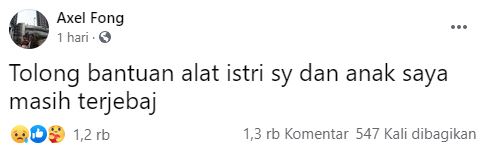 Lalu disusul 20 postingan berikutnya, yang narasinya singkat. Meminta tolong, memberi tahu alamat rumahnya. Mungkin dalam pikiran Axel, meski postingannya diketawai, yang penting dia sudah berusaha, dalam situasi yang ruang geraknya terbatas, Axel telah berbuat yang terbaik untuk menyelamatkan keluarga kecilnya, istrinya, ibunya, tiga anaknya, serta seorang karyawannya.