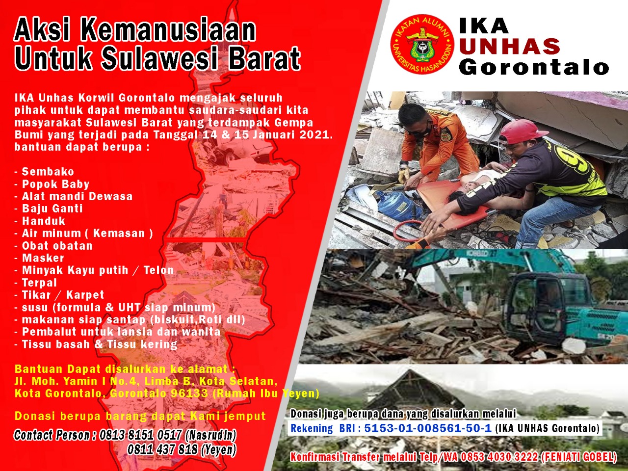 Puluhan korban jiwa akibat gempa yang meluluhlantakkan Majene dan Mamuju, Sulbar, mengetuk nurani IKA Unhas Gorontalo untuk membantu. Mereka membentuk posko penggalangan bantuan.