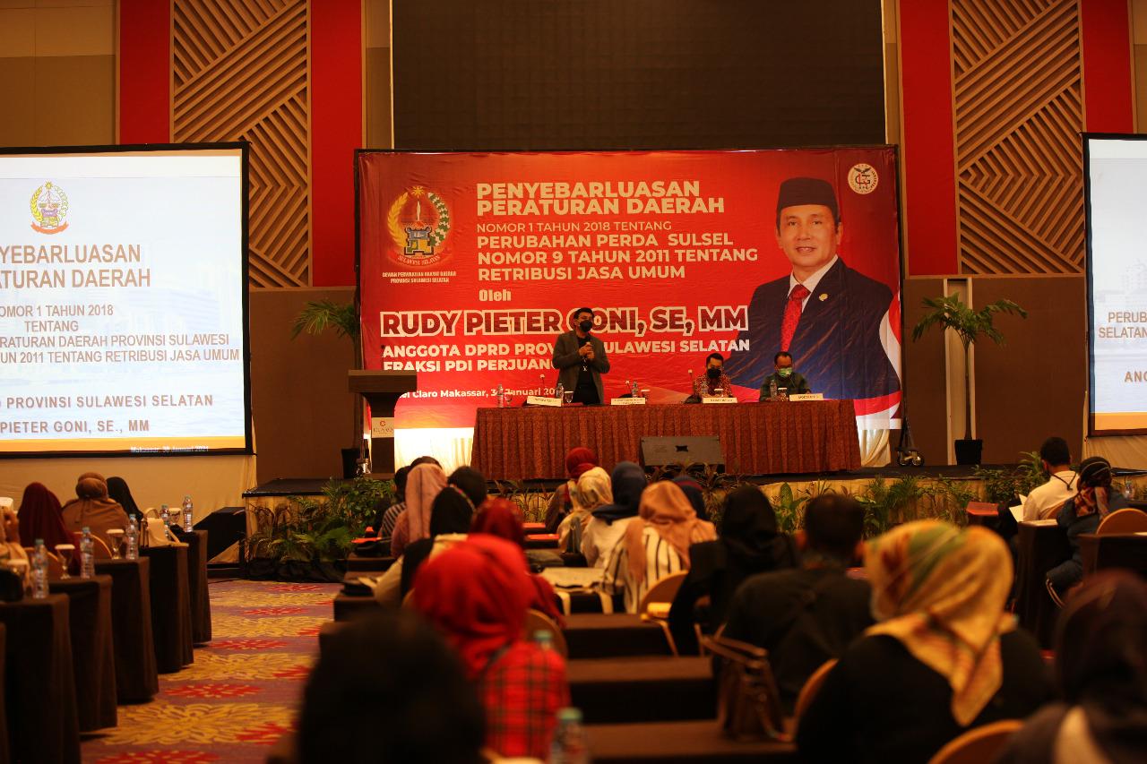 MAKASSAR, BUKAMATA - Legislator DPRD Provinsi Sulawesi Selatan dari Fraksi PDI Perjuangan Rudy P. Goni menggelar sosialisasi penyebarluasan peraturan daerah No. 1 tahun 2018 tentang Perubahan Peraturan Daerah Prov. Sul-sel No. 9 tahun 2011 tentang Retribusi Jasa Umum di Hotel Claro, Sabtu (30/01/2021).