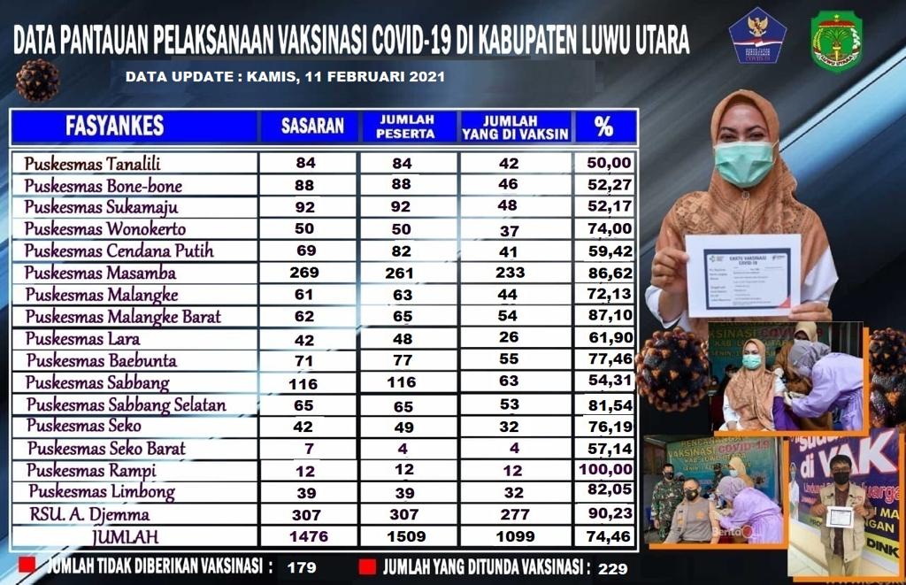 LUWU UTARA, BUKAMATA - Penyuntikan vaksin Covid-19 dosis pertama dalam kegiatan vaksinasi tahap pertama bagi tenaga kesehatan (nakes) di Kabupaten Luwu Utara usai sudah. Hasilnya, sebanyak 1.099 nakes telah disuntik vaksin Covid-19. Jika dipersentasekan, angkanya mencapai 74,46%. Cakupan vaksinasi dosis pertama ini terbilang cukup tinggi. Mengingat Pemda Lutra, dalam hal ini Dinas Kesehatan, “hanya” menargetkan 70% cakupan vaksinasi bagi nakes.