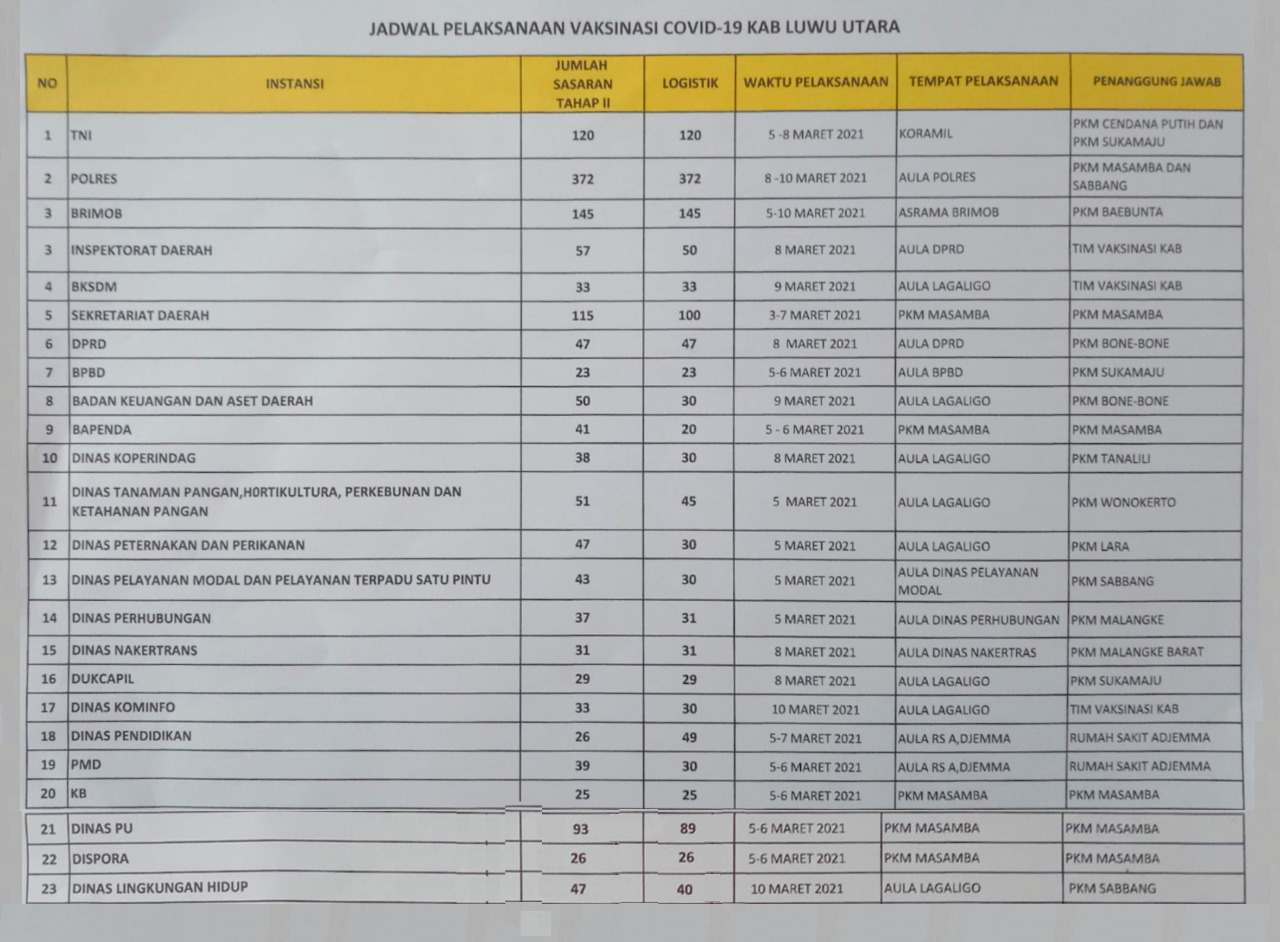 Dalam surat tersebut, tertera jadwal vaksinasi COVID-19 bagi seluruh ASN di masing-masing Perangkat Daerah (PD) Lingkup Pemda Luwu Utara. Sekretariat Daerah menjadi PD pertama yang mendapatkan vaksinasi dengan jumlah 100 dosis yang dimulai pada 3 – 7 Maret 2021 bertempat di Puskesmas Masamba.