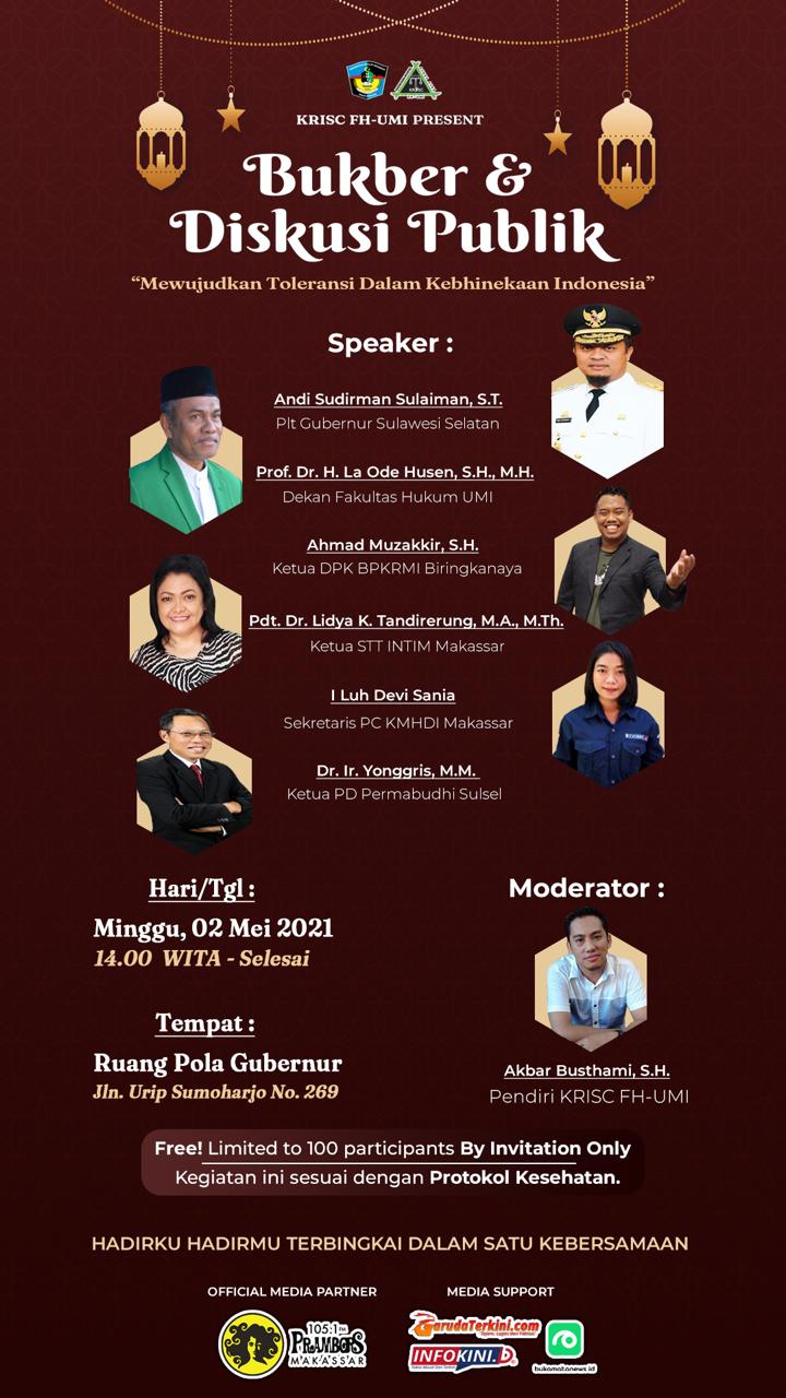 MAKASSAR, BUKAMATA - Minggu, 2 Mei 2021. Bertempat di ruang pola Kantor Gubernur Sulsel, KRISC FH-UMI menggelar diskusi publik. Temanya, "Mewujudkan Toleransi Dalam Kebhinekaan Indonesia".