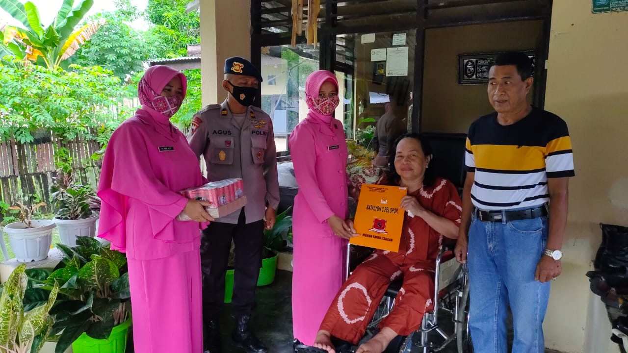 Komandan Batalyon Danyon C Pelopor Satbrimob Polda Sulsel Kompol Nur Ichsan,S.Sos. bersama Ketua Ranting Bhayangkari Batalyon C Pelopor Ny. Upik Ichsan, menyerahkan bantuan sosial bagi para Warakawuri dan anak-anak dari mantan personel Batalyon C Pelopor.