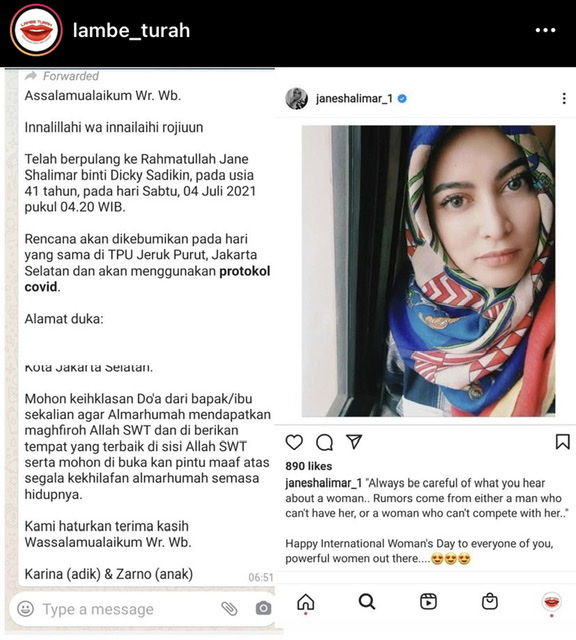 Kabar duka ini datang dari pesan singkat yang disebarkan adik dan kak Jane Shalimar, Karina dan Sharno melalui pesan whatshapp yang diposting ulang akun @lambe_turah di sosial media.