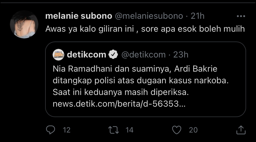 Artis sekaligus aktivis Melanie Subono turut menyoroti ditangkapnya Nia Ramadhani dan Ardianysah Bakrie terkait kasus dugaan penyalahgunaan narkoba.