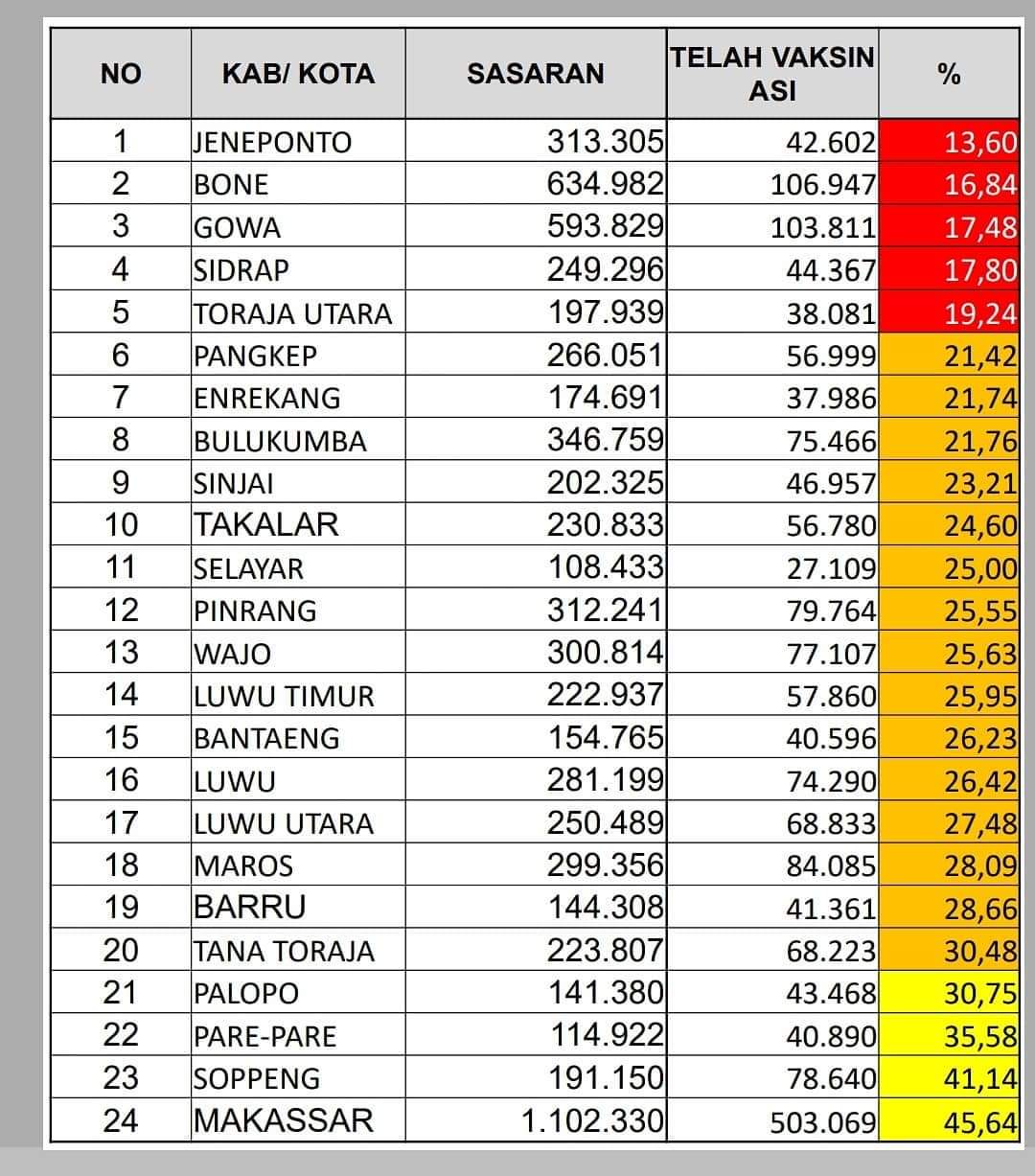 BONE, BUKAMATA - Pemprov Sulsel mempublikasikan daftar daerah yang penduduknya masih sedikit melakukan vaksin. Ada lima daerah yang diberi warna merah. Pertanda rasio penduduknya yang sudah vaksin rendah.