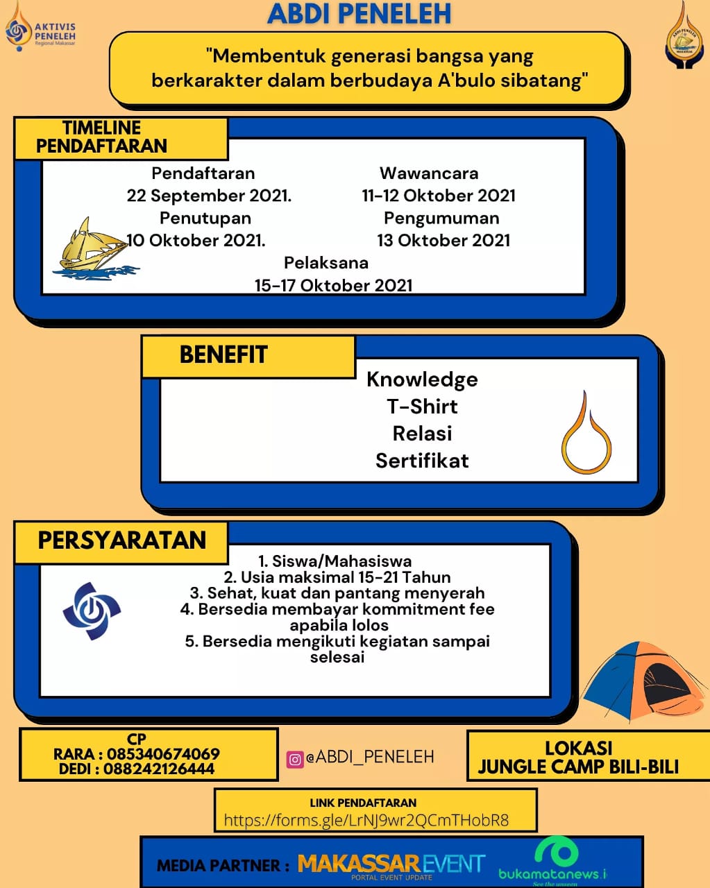 Abdi Peneleh akan digelar di Jungle Camp Bili-bili. Untuk mengembalikan semangat belajar para pelajar dan mahasiswa, yang sempat diruntuhkan pandemi Covid-19 dengan kejenuhan belajar daring.