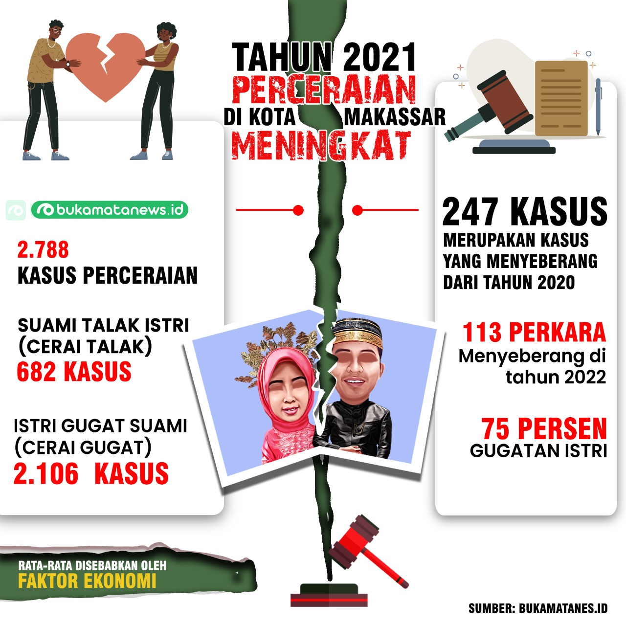 MAKASSAR, BUKAMATA - Angka perceraian di Kota Makassar mengalami kenaikan yang cukup signifikan di tahun 2021 lalu. Berdasarkan data dari Panitera Pengadilan Agama (PA) Kelas IA Makassar, di tahun 2021 ada 2.788 kasus yang diputuskan. Jumlah ini lebih banyak dibanding tahun 2020 yang jumlahnya di bawah 2.000 kasus.