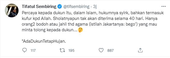 “Hanya orang-orang bodoh atau jahil tergadap agama (istilah Jakartanya: bego’) yang mau minta tolong kepada dukun. *AdaDukunTetapHujan,”lanjut tulis Tifatul Sembiring.