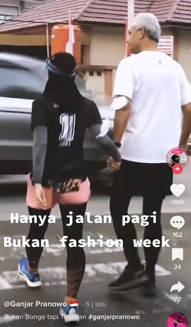 Mengenakan pakaian olahraga, Ganjar Pranowo dan Siti Atikoh berjalan menyebrangi zebra cross tersebut selayaknya para remaja di Citayaman Fashion Week.