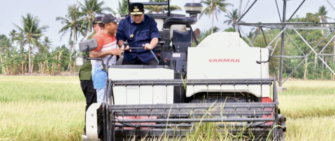 PINRANG, BUKAMATA - Penjabat Gubernur Sulsel, Bahtiar Baharuddin, melakukan kunjungan kerja di Kabupaten Pinrang untuk pesta panen padi di Desa Pananrang, Kecamatan Mattiro Bulu, Kamis, 2 November 2023. Bahtiar melakukan panen dengan memotong padi menggunakan combine harvester.