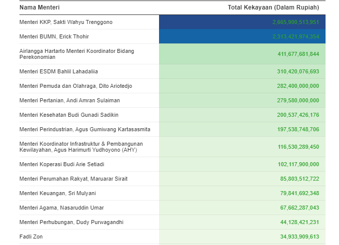 Menurut data Laporan Harta Kekayaan Penyelenggara Negara (LHKPN) yang diakses dari elhkpn.kpk.go.id, Menteri Kelautan dan Perikanan, Sakti Wahyu Trenggono, tercatat sebagai menteri terkaya di kabinet ini. Dengan total kekayaan fantastis mencapai Rp 2,67 triliun, Trenggono menduduki posisi teratas. Sumber kekayaannya sebagian besar berasal dari tanah, bangunan, serta surat berharga senilai Rp 2,23 triliun.
