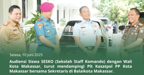 MAKASSAR. BUKAMATANEWS — Pemerintah Kota Makassar menerima kunjungan audiensi dari para siswa Sekolah Staf dan Komando (SESKO) pada Selasa, 10 Juni 2025, bertempat di Balaikota Makassar. Audiensi tersebut dipimpin langsung oleh Wali Kota Makassar, Munafri Arifuddin, dan turut didampingi oleh Pelaksana Tugas (Plt) Kepala Satuan Polisi Pamong Praja (Satpol PP), Dr. H. Fathur Rahim, S.T., M.T., serta Sekretaris Satpol PP Kota Makassar.