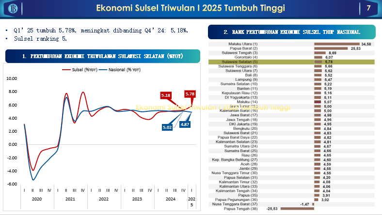 “Pertumbuhan ekonomi Sulsel pada awal tahun 2025 menunjukkan tren positif. Ini adalah sinyal yang menggembirakan, mengingat berbagai tekanan global dan perlambatan ekonomi nasional,” ungkap Dhony.