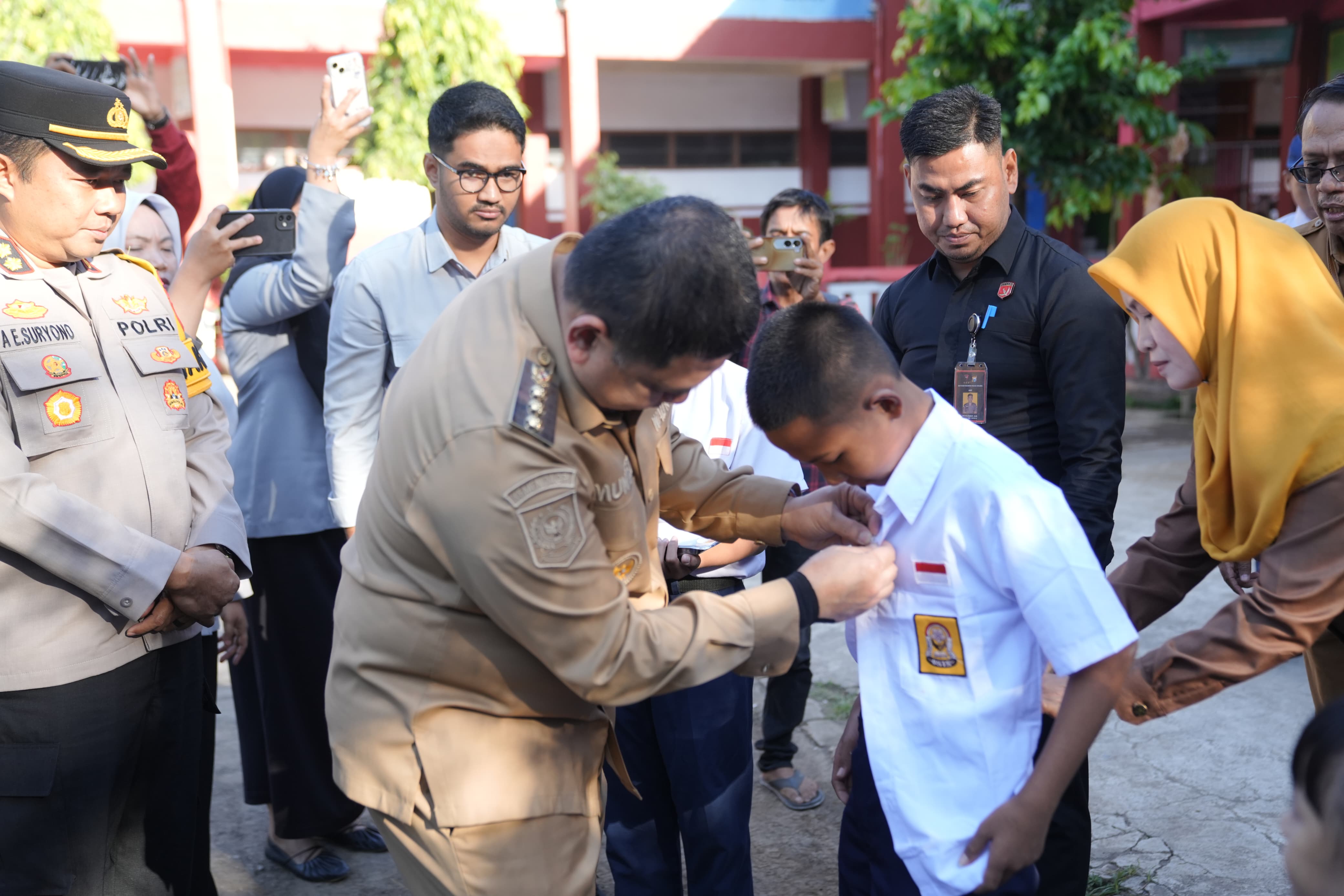 Penyerahan seragam perdana dilakukan di dua sekolah, yakni SD Lariang Bangi dan SMP Negeri 46 Makassar. Wali Kota Munafri atau yang akrab disapa Appi, menyerahkan langsung dua stel seragam utama—merah putih untuk siswa SD dan biru putih untuk siswa SMP—secara simbolis kepada para siswa baru.