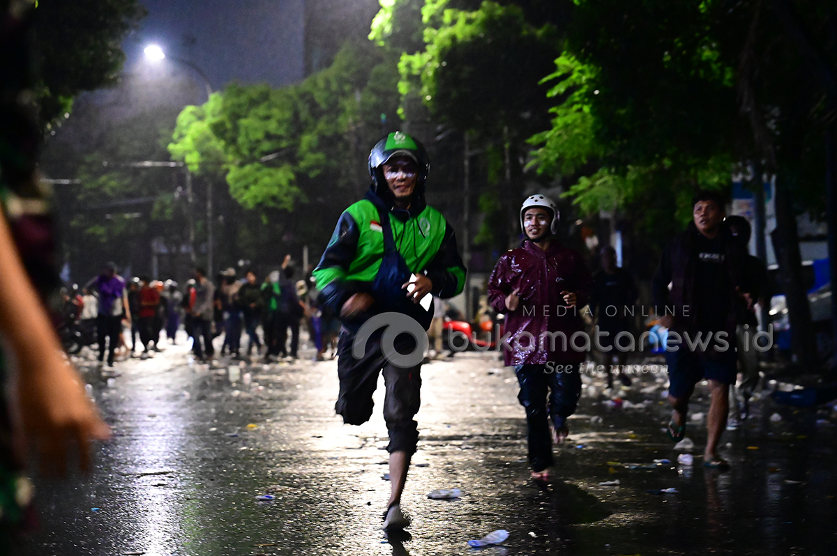 Di sisi lain, personel Brimob memilih bertahan di dalam markas dan menembakkan gas air mata untuk membubarkan kerumunan. Namun, aksi saling serang tak terhindarkan. Massa melawan dengan melempar batu, petasan, hingga botol ke arah markas.