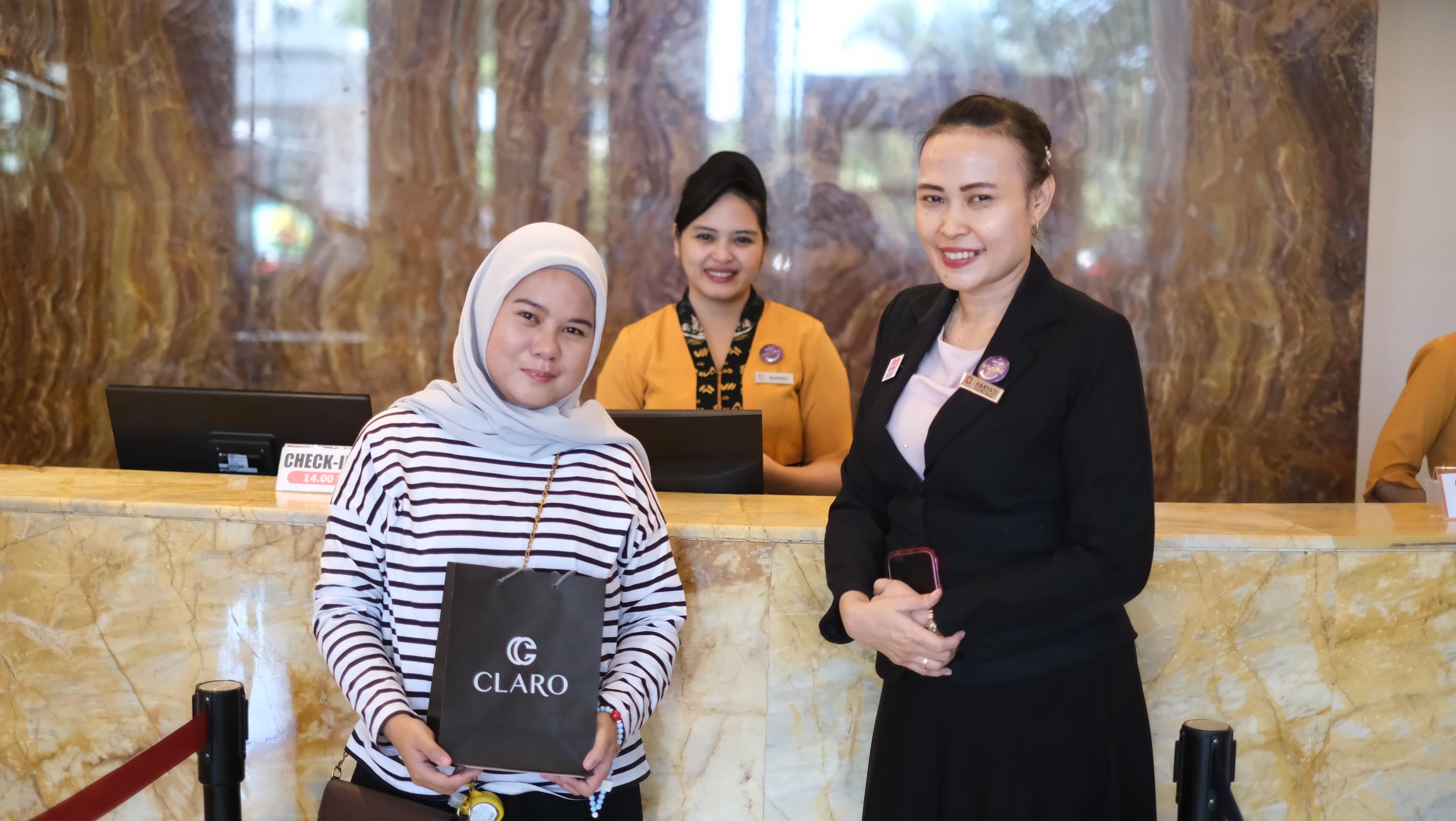 General Manager Hotel Claro Makassar, Bapak Anggiat Sinaga, secara langsung menyambut dan menyerahkan souvenir kepada para tamu. Ia menekankan bahwa momen ini merupakan wujud syukur dan penghargaan atas loyalitas pelanggan yang telah memilih Claro Makassar sebagai tempat menginap dan bersantap.