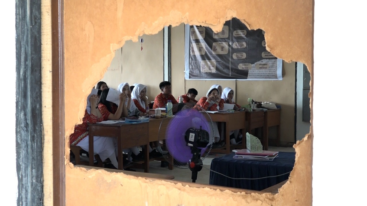 Lebih memprihatinkan lagi, balok kayu penyangga atap mulai lapuk. Setiap kali hujan deras disertai angin kencang, para guru terpaksa mengevakuasi siswa keluar ruang kelas karena khawatir atap ambruk.