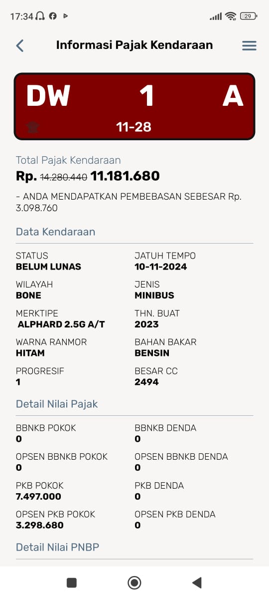 Tak hanya itu, kendaraan dinas Bupati Bone, jenis Toyota Alphard bernomor polisi DW 1 A, juga tercatat belum diperpanjang masa berlaku pajaknya. Dalam aplikasi Bapenda, nilai pajak mobil mewah tersebut sebesar Rp11.181.680, turun dari Rp14.280.440 setelah mendapat pembebasan pajak sebesar Rp3.098.760. Pajak itu seharusnya dibayarkan paling lambat pada 10 November 2024.